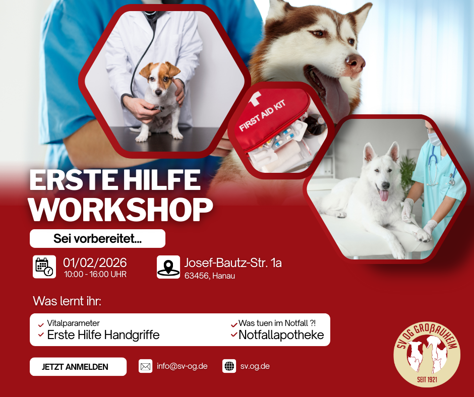 Erste Hilfe am Hund – Workshop bei der OG Großauheim Sei vorbereitet, wenn jede Minute zählt. Am 01.02.2026 findet bei der OG Großauheim ein Erste-Hilfe-Workshop am Hund statt – praxisnah, verständlich und direkt anwendbar. Geleitet wird der Workshop von Carmen Sauer, Hundephysiotherapeutin & Tiermedizinische Fachangestellte (TFA). In diesem Workshop lernst du: ✔️ wie du die […]