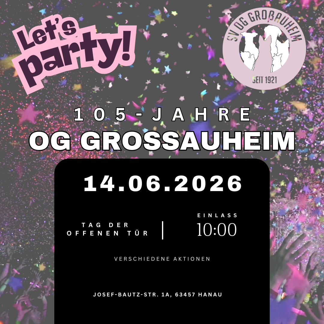 Einladung zum 105-jährigen Vereinsjubiläum SV-OG Großauheim Der SV-OG Großauheim feiert 105 Jahre Vereinsgeschichte – und das möchten wir gemeinsam mit euch feiern! 📅 Sonntag, 14. Juni 2026 🕙 Beginn: ab 10:00 Uhr 📍 Vereinsgelände Josef-Bautz-Str. 1a, 63457 Hanau Freut euch auf einen besonderen Jubiläumstag mit spannenden Einblicken in den Hundesport, guter Musik und entspanntem […]